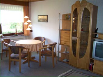 Das Wohnzimmer ist durch die großen Fenster, sowie die Terrassentür sehr hell und freundlich. Eine moderne Schrankwand mit Stereoanlage und Fernseher, sowie eine Leseecke mit vier Sitzplätzen machen das größte Zimmer zum zentralen Mittelpunkt der Wohnung.